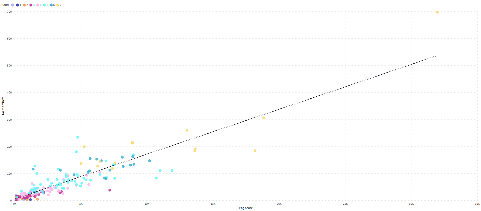 The image above shows a scatter graph of the number of BUFDG users per institution against the 'engagement score' (a proxy for the amount of use of our resources) per institution for the period covered by this report. Almost all institutions are at or very close to the average line plotted across the graph, which is great to see as it means all our member institutions are getting pretty much equal value from their membership. (The different colours just relate to the different membership bands/size of institution).
